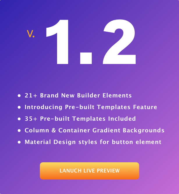 - Neues Element: Bildvergleich - Zeigen Sie Ihre Vorher-Nachher-Bilder an - Neues Element: Expanding Section - Zeigen Sie Ihre wichtigen Inhalte in perfekter Weise an - Neues Element: Profilbereich - Zeigen Sie Ihre Team- oder Kundenprofile mit einem schönen Layout an - Neues Element: Verlaufstitel - Hinzufügen von Verlaufsfarben zu Überschriften in Ihrer Site - Neues Element: Bildfilter - Zeigen Sie Ihr Portfolio oder Ihre Bilder mit sortierbaren Filtern an - Neues Feature: Vordefinierte Materialdesign-Farbschemata für Button-Elemente - Neues Feature: Farbverlauf Hintergrund-Funktion ist jetzt für Spalten verfügbar - Neues Feature: Vordefinierte Vorlagen für den Einstieg. Steigern Sie jetzt Ihren Website-Design-Prozess - Verbesserung: Produktregistrierung hinzugefügt, um glänzende Updates für zukünftige Versionen des Plugins zu ermöglichen - Verbesserung: Skripte werden jetzt mit dynamischen js in die Warteschlange eingereiht, um die Ladezeit zu erhöhen - Verbesserung: Die Admin-Einstellung zur Steuerung der Stil-Enqueue hängt von Ihrer Anforderung ab - Verbesserung: Admin-Einstellung hinzugefügt, um Container- und Spalten-Farbverlaufshintergründe zu aktivieren / deaktivieren - Verbesserung: Admin-Hinweis wird angezeigt, wenn Fusion Builder deaktiviert ist, um Konflikte zu vermeiden - Improvement: Standard-Separator-Textfarbe für Dual-Button geändert - Behoben: Load plugin textdomain fehlt - Behoben: Benutzerdefinierte Klasseneinstellung für Container funktioniert aufgrund des Container-Hintergrundes nicht - Korrigiert: Die Option zum Anwenden der Option "Grad anwenden" ignoriert die Einstellung - Fixed: Button Shortcode Generator funktioniert nicht mit Fusion Builder Element Generator, wenn im Child Element Editor verwendet