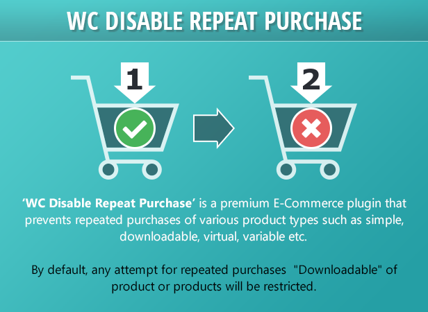 - "WC Disable Repeat Purchase" ist ein erstklassiges E-Commerce-Plugin, das den wiederholten Kauf verschiedener Produkttypen verhindert - beispielsweise einfache, herunterladbare, virtuelle, variable usw.