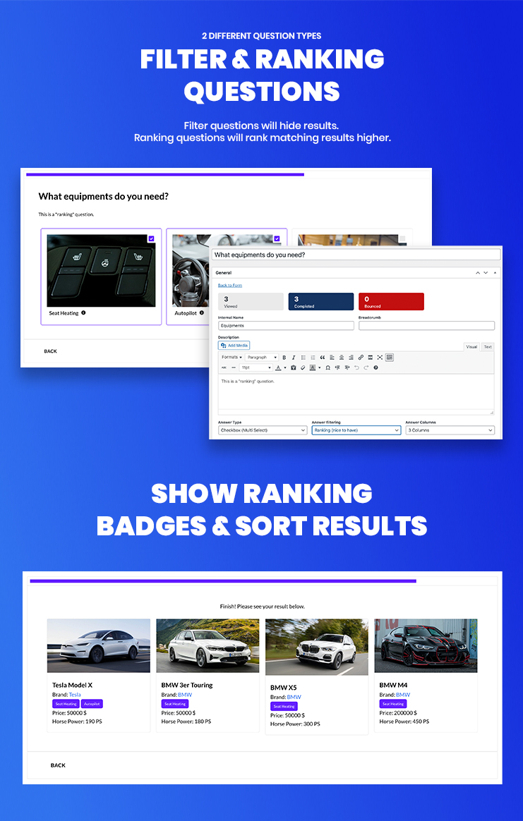 Manche Features sind nur nice to have. Deshalb haben wir Ranking-Fragen integriert. Diese werden die Endergebnisse höher einstufen, wenn bestimmte Antworten mit Ihren Daten übereinstimmen. Neben dem Filtern von Fragen werden die Ergebnisse hart gefiltert.