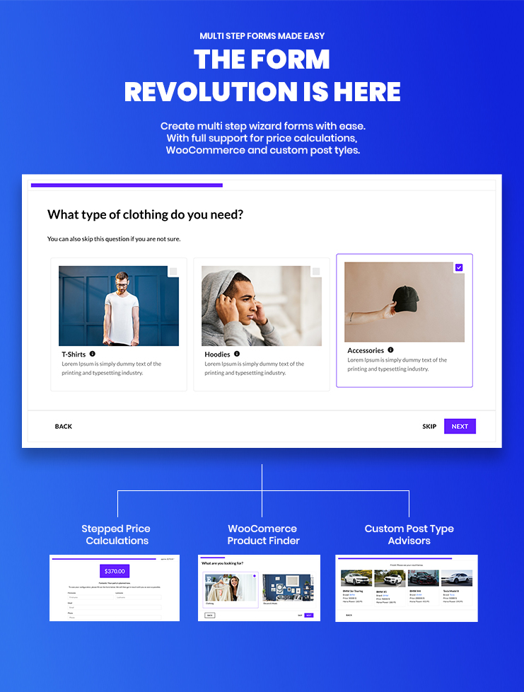 Gelangen Sie spielerisch zum richtigen Preis, Service oder Produkt. Mit dem WordPress Wizard Guides-Plugin können Sie mühelos mehrstufige Formulare erstellen. Erstellen Sie interaktive Preiskalkulationen, geführte Verkaufsdienste oder WooCommerce-Produktberater und steigern Sie Ihre Conversions noch heute auf unbekannte Grenzen! Beginnen Sie mit unbegrenzten Fragen, Antworten und endlosen Möglichkeiten.