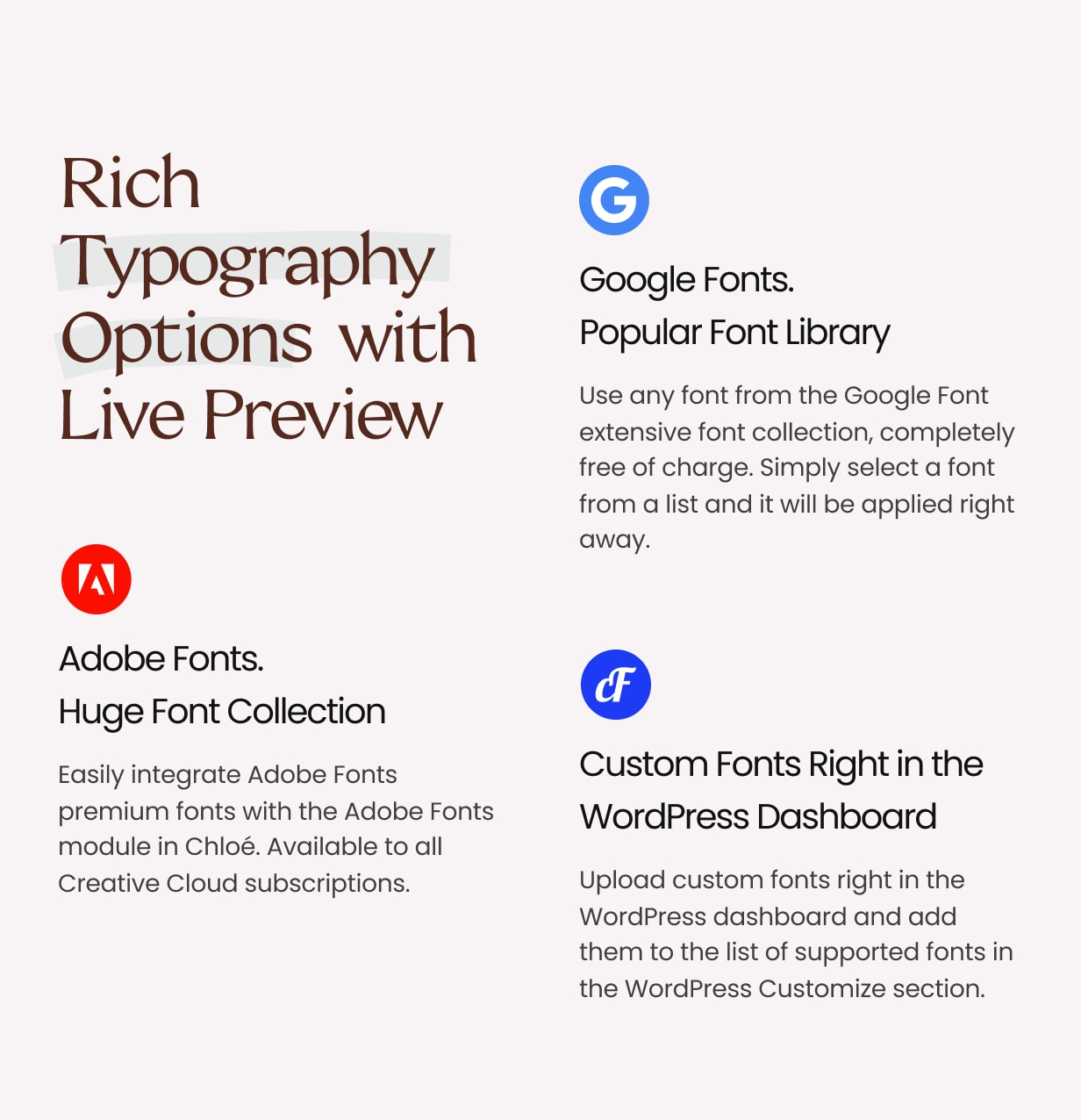 Upload custom fonts right in the WordPress dashboard and add them to the list of supported fonts in the WordPress Customize section. No coding required.