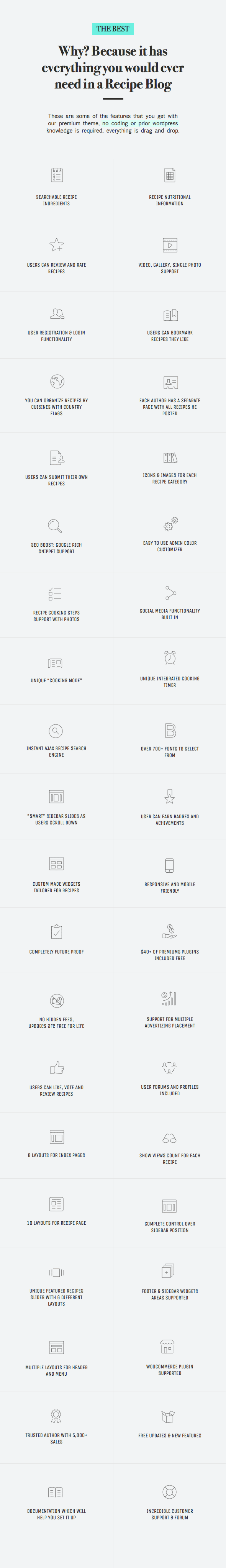 Präsentieren Sie Ihr persönliches Kochblog mit einem einfachen und übersichtlichen Layout, gestalteten Rezepten und vielem mehr. Wir haben uns speziell auf Food-Blogger konzentriert und sie gefragt, was sie genau brauchen. Wir haben einige großartige Funktionen integriert, wie einen super benutzerfreundlichen Zutaten-Builder, eine Nährwertdaten-Box und informative Schritte mit Fotos, damit Ihre Follower leichter kochen können Ihre Rezepte.