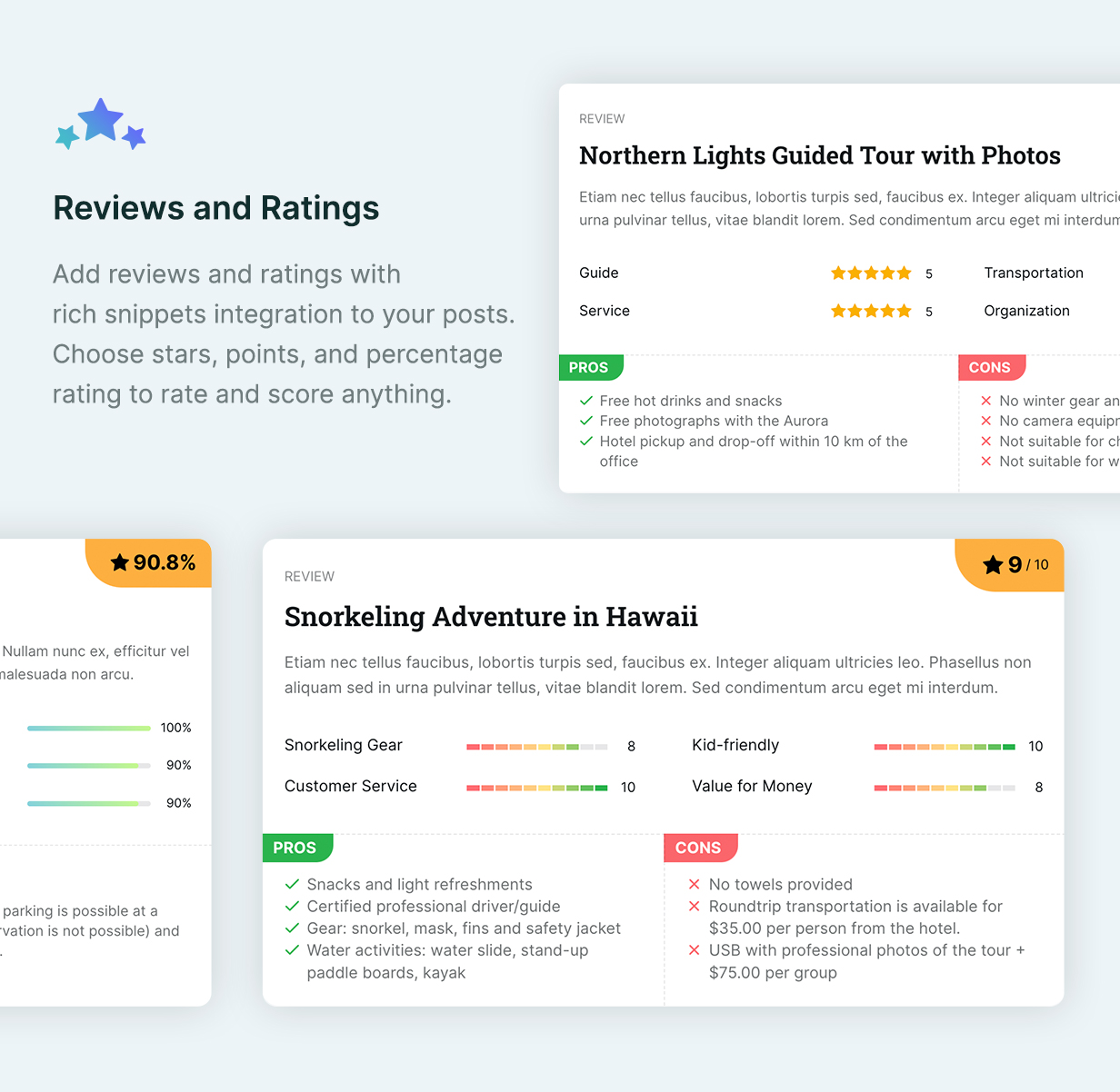 Fügen Sie Rezensionen und Bewertungen mit Rich Snippets-Integration zu Ihren Beiträgen hinzu. Wählen Sie Sterne, Punkte und eine prozentuale Bewertung, um alles zu bewerten und zu bewerten.
