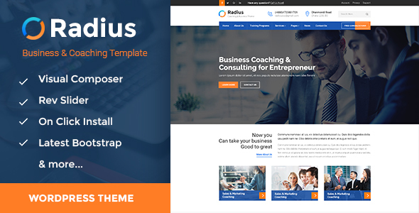 Radius - Training, Coaching, Beratung und Business WordPress-Template ist ein Premium-WordPress-Template, dessen Design sich insbesondere auf Training und Coaching bezieht und das es Ihnen ermöglicht, eine Vielzahl von Business-Websites zu erstellen.