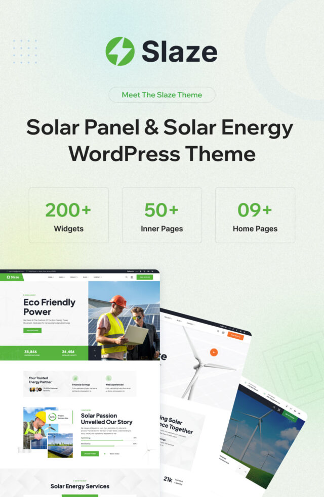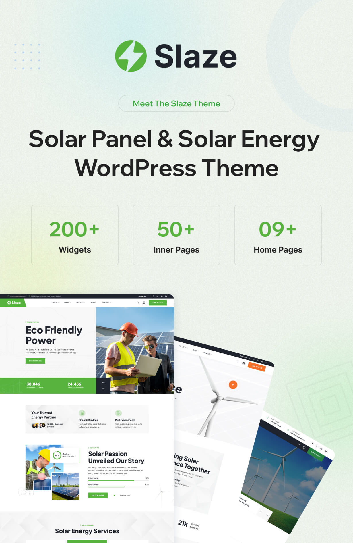 Slaze – WordPress-Layout für Solar- und erneuerbare Energien ist eine sorgfältig gestaltete Website-Vorlage, die speziell für Solar & Renewable Energy Company entwickelt wurde. Die mit dem Elementor-Seitenersteller erstellte Vorlage bietet ein professionelles und modernes Erscheinungsbild und ist somit die ideale Wahl für Solarunternehmen, die eine Online-Präsenz anstreben.
