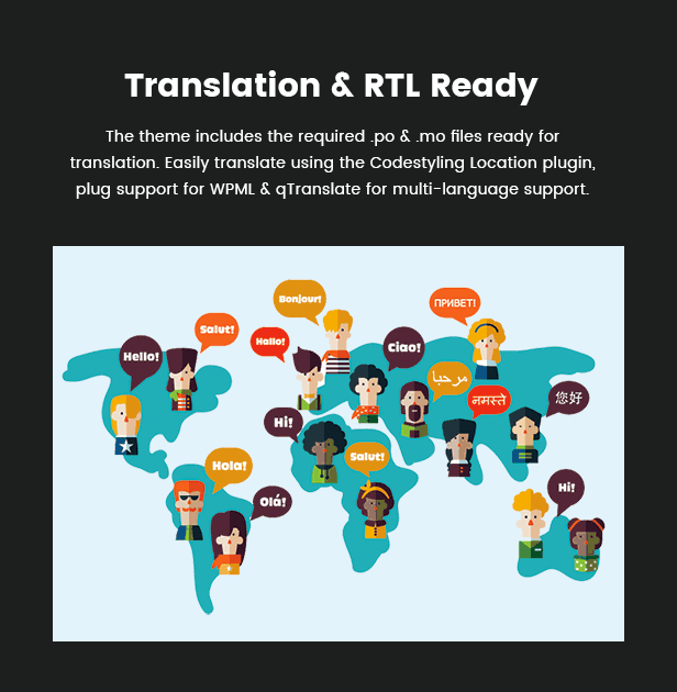 Das Thema enthält die erforderlichen .po & .mo-Dateien, die zur Übersetzung bereit sind. Einfache Übersetzung mit dem Codestyling Location-Plugin, Plug-Unterstützung für WPML und qTranslate für mehrsprachige Unterstützung.