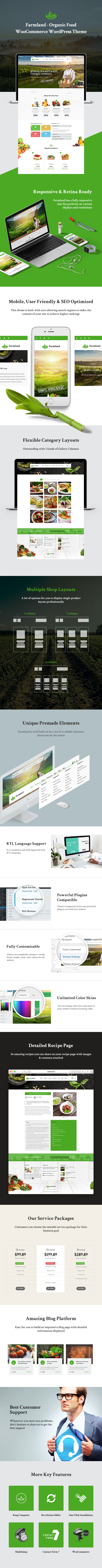 Farmland - Bio-Lebensmittel WooCommerce WordPress Template ist ein perfektes Thema für Sie, um alle Arten von Bio- und Öko-Farm-Produkten wie Lebensmittel, Obst, frisches Gemüse, Kosmetika, Saatgut, vegetarisches Essen, Kaffee und Kuchen oder Blumenladen zu verkaufen. Mit 2 speziellen Homepages können Sie eine freundliche Ansicht erstellen mit Kunden auf den ersten Blick. Die gesamte Website besteht aus einer grünen Farbe aus gesundem Obst und köstlichen Gemüsen zusammen mit ausreichend großartigen Effekten vorgefertigter Elemente, die die Besucher wirklich frisch fühlen lassen.