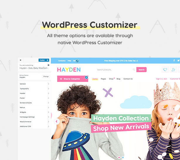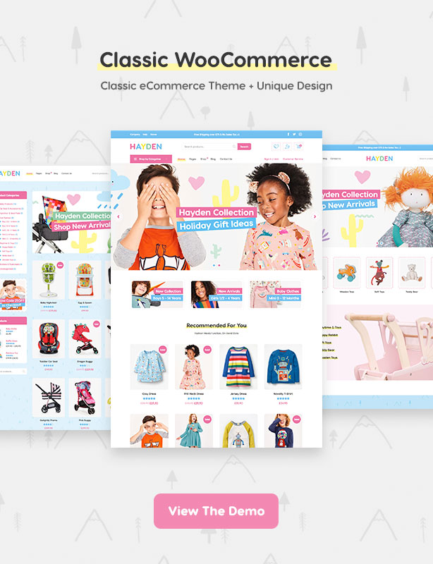 Hayden ist ein klassisches WooCommerce WordPress Layout mit einzigartigen Designdetails. Speziell für Kindermode. Spielzeug & Spiele und Baby Produkte Online-Shop. Bringen Sie Ihre WooCommerce-Website mit dem Hayden WordPress Layout auf die nächste Stufe.