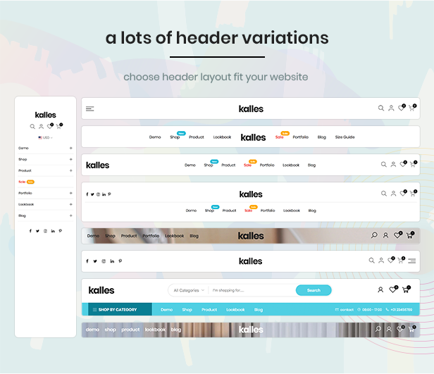 Kalles unterstützt bis zu 9 Header-Optionen. Kunden werden Ihren Shop von der ersten Sekunde an, in der sie den Header sehen, als professionell empfinden.