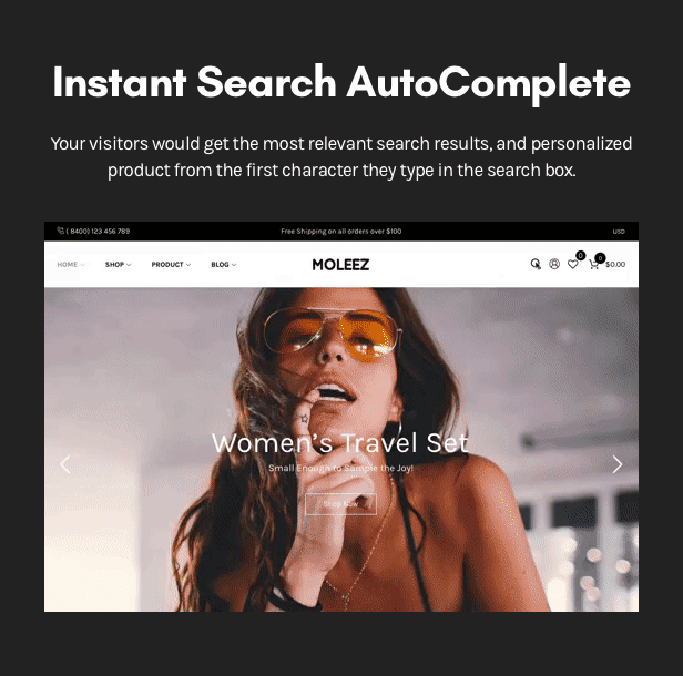 Moleez ist ein sauberes und minimales WooCommerce-Design für Online-Shops. Mit minimalem Design und Produktorientierung wird Moleez Ihren Online-Shop beeindruckender und attraktiver für die Zuschauer machen. Mit diesem WooCommerce-Design können Sie es für viele E-Commerce-Websites wie Modegeschäfte, Möbelhäuser, Dekorationsgeschäfte usw. verwenden.