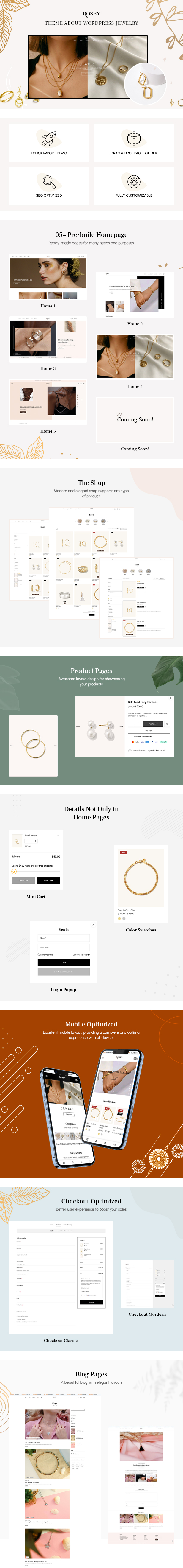 Rosey von Wpbingo ist ein starkes WP-Thema für WooCommerce-Schmuckläden. Es verwendet die neueste Version von Bootstrap als Back-End-Framework, und Sie werden das Design dieses Themas leicht beeindruckend und für Ihr Geschäft geeignet finden. Rosey legt großen Wert darauf, Produkte nach Kategorien auszurichten. Es zeigt aber auch, wie bestimmte Webkomponenten. Ein Design, das Komponenten integriert, um besondere Produkte hervorzuheben.