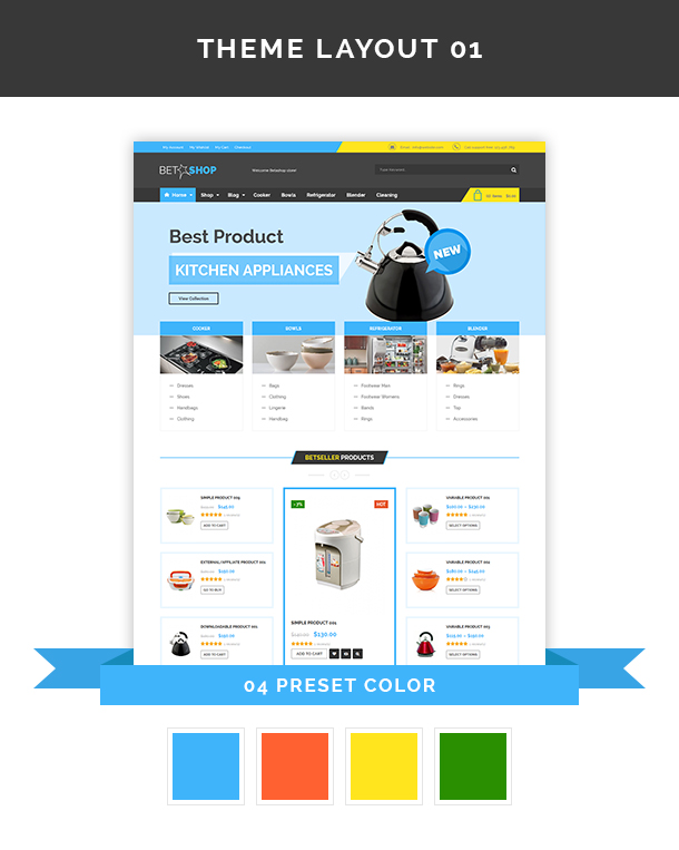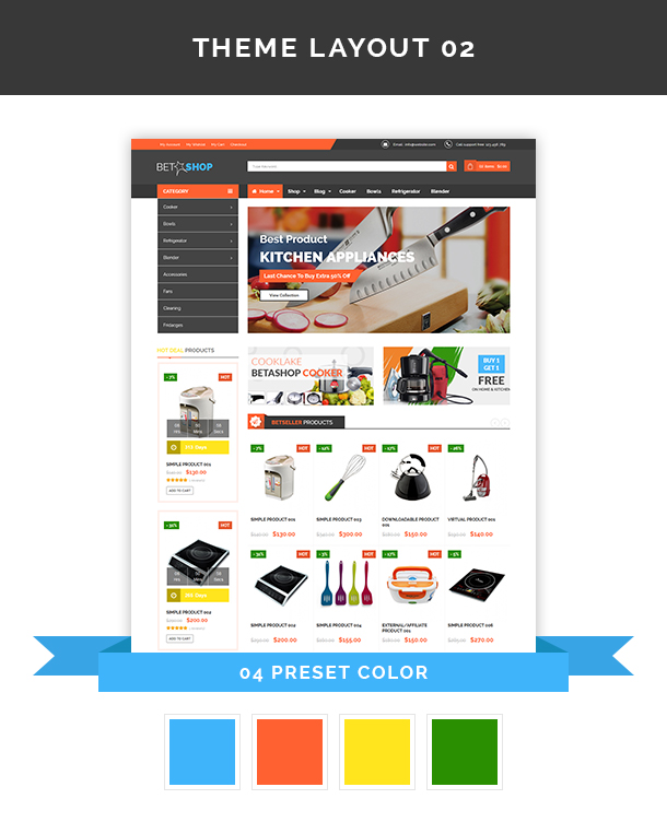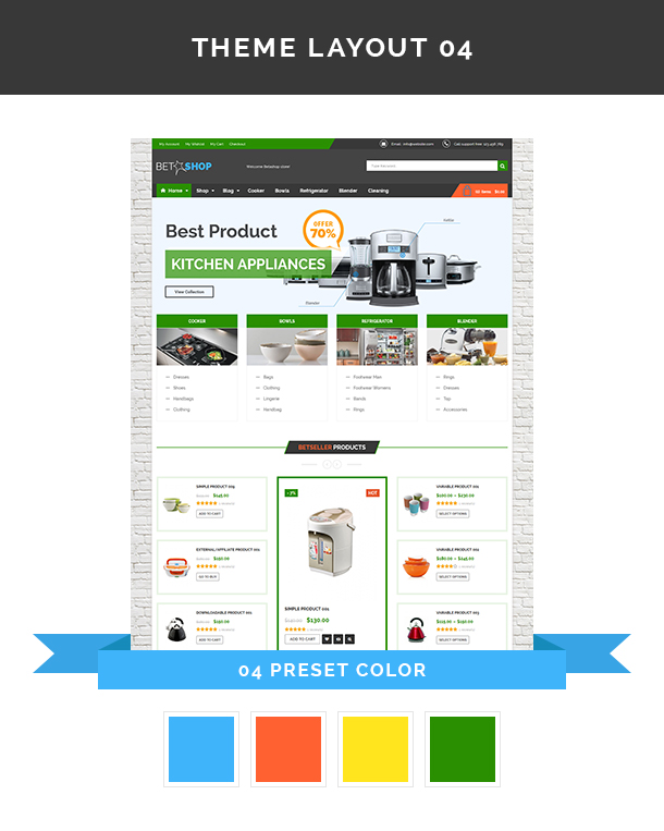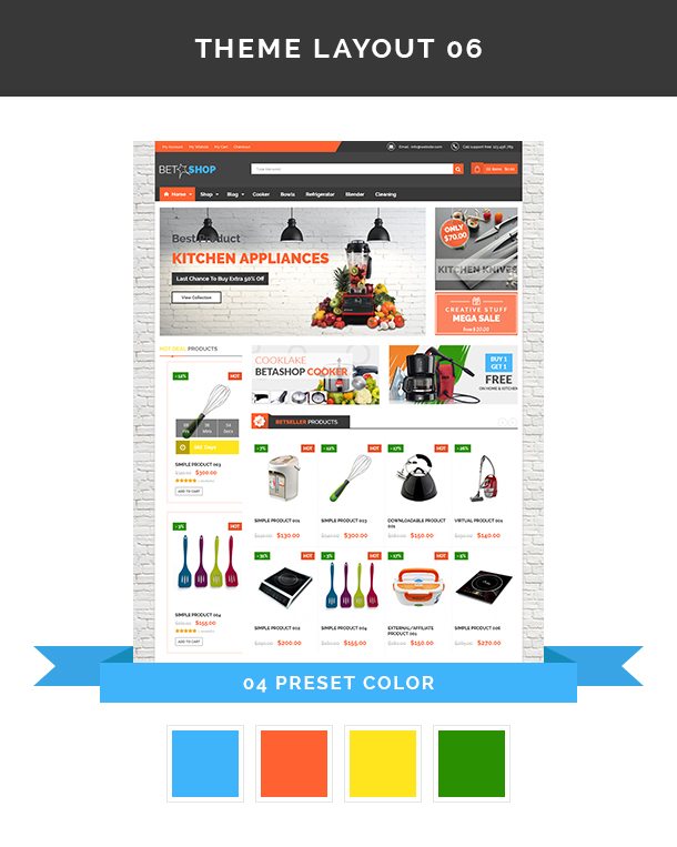 VG BetaShop - WooCommerce Vorlage für Küchengeräte ist eine gute Wahl für all diese Dinge. Es verfügt über 6 Layouts und 4 voreingestellte Farben mit einem Design-Bedienfeld ohne Markenzeichen, das Ihnen die vollständige Kontrolle über die Anpassung Ihrer Website gibt.