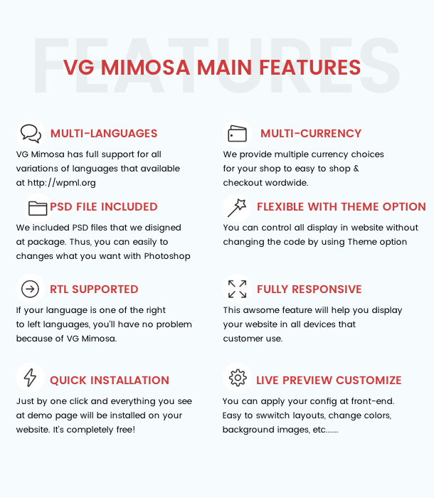 VG Mimosa - Moderne Mode WooCommerce WordPress-Vorlage Die WooCommerce-Plattform enthält 6 vorgefertigte Websites. Responsive und Retina sind beide bereit, jedes einzelne Element ist so gestaltet, dass es in allen gängigen Geräten, Desktop, Tablet und Mobile, ein hervorragendes Erscheinungsbild zeigt.