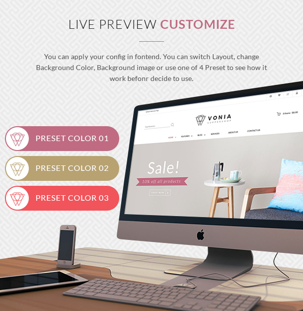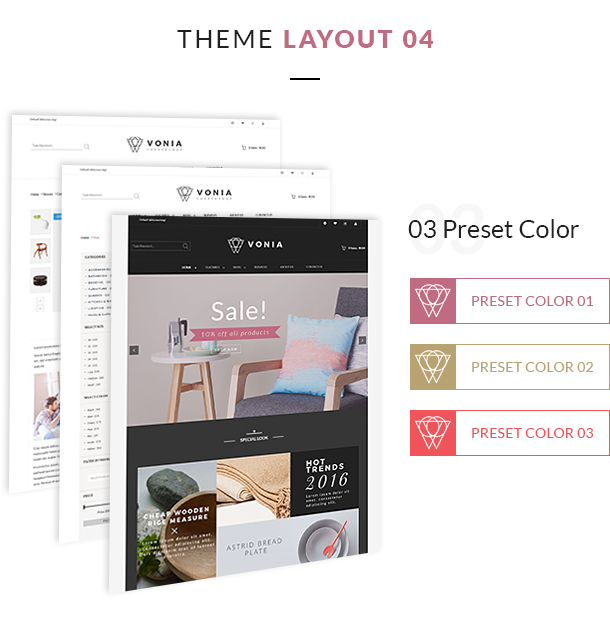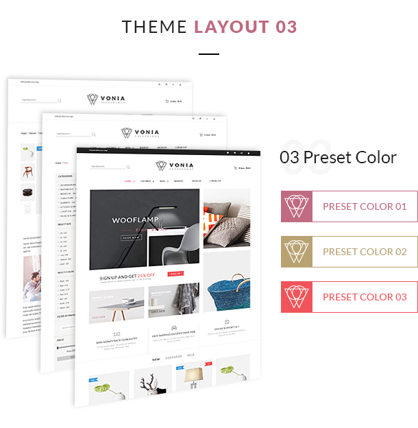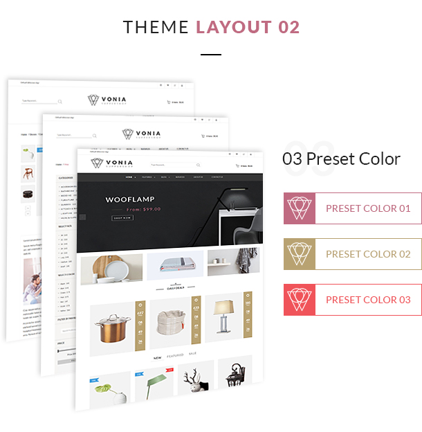 VG Vonia ist ein minimalistisches und sauberes WooCommerce-Template mit 4 einzigartigen Layouts, 3 Presets Color und eignet sich für Online-Möbelhäuser, handgefertigte Geschäfte, Modegeschäfte und digitale Geschäfte.
