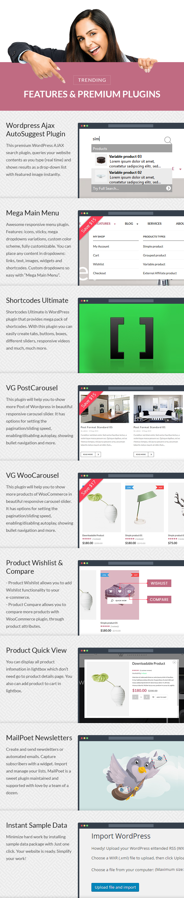 Das Thema beinhaltet 4 einzigartige Designlayouts (mit 3 Voreinstellungen Farbe für jedes Layout) und 3 Themenbox-Layouts (Mit 16 Hintergrundfarben und 31 Hintergrundbildern können Sie den Stil beliebig mischen.). Es bietet unzählige Seitenvorlagen, die Sie zum Einrichten Ihres Digital Products Store verwenden können. Im Lieferumfang ist ein Design-Bedienfeld enthalten, das keine Markenzeichen enthält. So haben Sie die vollständige Kontrolle über die Anpassung Ihrer Website. Es ist mit dem visuellen Drag & Drop-Composer integriert, damit Sie ein unbegrenztes Seitenlayout für Ihre Website erstellen können.