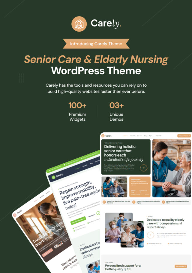 Carely ist ein mitfühlendes und wunderschön gestaltetes WordPress -Thema, das für Senior Care Center, ältere Pflegeheime, Altersvorsorge und häusliche Pflegedienste erstellt wurde. Mit einer ruhigen und vertrauenswürdigen Ästhetik hilft Ihnen, Ihre Dienste mit Professionalität zu präsentieren und gleichzeitig eine fürsorgliche und unterstützende Online -Präsenz aufzubauen.