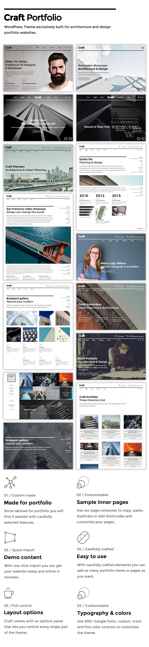 Egal, was Sie zeigen möchten, die Funktionen von Craft Portfolio passen perfekt zu allen Arten von Architektur-, Design- und Design-Portfolios. Das Craft Portfolio ist auf Architektur-, Design- und Design-Portfolio zugeschnitten und mit sorgfältig ausgewählten und handgefertigten Funktionen ausgestattet. Craft Portfolio wird mit gebrauchsfertigen Demo-Inhalten geliefert. Mit einem Klick können Sie Ihre Website in wenigen Minuten erstellen.