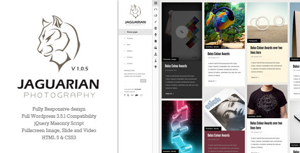 Sie suchen ein sauberes und flexibles Portfolio. Jaguar ist eine Wahl für dich. Ein leistungsstarkes Responsive Design für alle, die alle schönen Bilder und Videos speichern und an die Öffentlichkeit weitergeben möchten. Ein perfektes integrierendes System, sehr flexibel für Benutzer, wenn es leicht auf Ipad und Iphone verwendet werden kann.