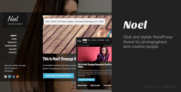 Noel ist OnePage WordPress Vorlage mit scharfen Linien und elegantem Design. Es kann als persönliches Portfolio, Projektpräsentation oder Fotografen-Website verwendet werden. Noel ist unter anderem komplett ajax-gesteuert, hat 17 Shortcodes, 4 eigene Seitenvorlagen, Hintergrundwechsler, Site Intro und Fotogalerie, die Bilder direkt von Flickr, Picasa oder Instagram laden können