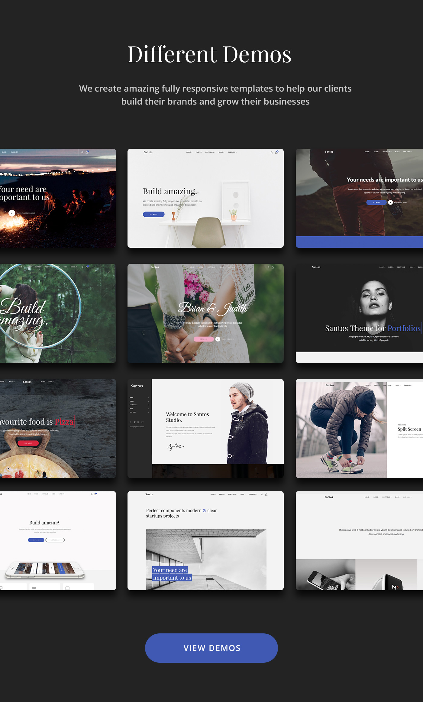 Santos ist ein vielseitiges, sauberes, kreatives, vollständig ansprechendes und leistungsstarkes WordPress-Template. Das Santos-Design enthielt mehrere Header-Layouts, einen visuellen Seiten-Builder für Drag & Drop, ein leistungsfähiges Design-Bedienfeld, einen Parallax-Hintergrund, Google Font und weitere großartige Funktionen. Santos ist die beste Wahl für Ihr Unternehmen, Ihre Kreativagentur oder Ihr persönliches Portfolio, Ihre Fotografie oder eine Blogging-Website.