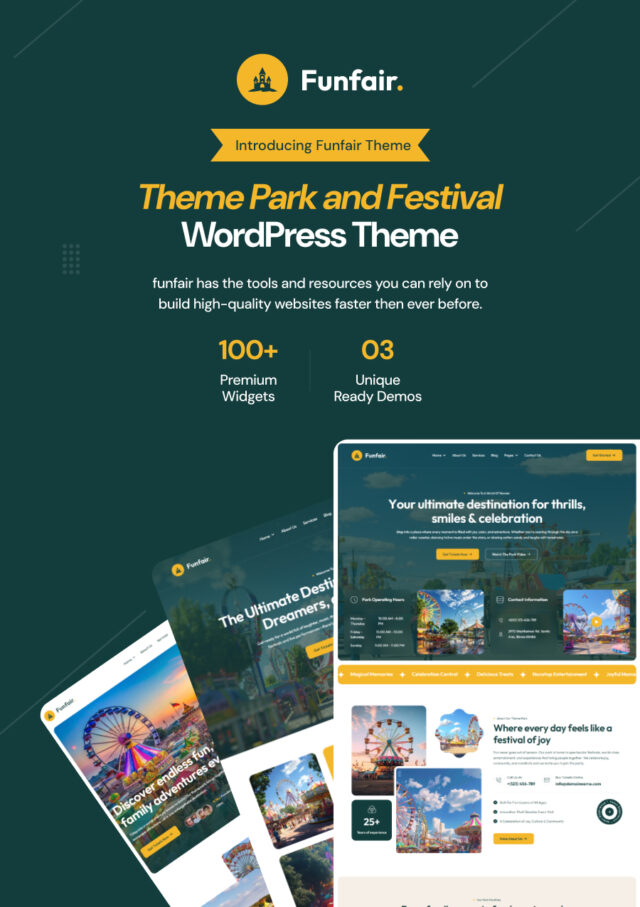 Funfair ist ein lebendiges und ansprechendes WordPress-Layout, das für Themenparks, Vergnügungsparks, Wasserparks, Karnevale und Familienunterhaltungszentren entwickelt wurde. Mit einem verspielten Design und lebendigen Bildern hilft es Ihnen, Attraktionen, Fahrgeschäfte, Tickets, Veranstaltungen und Aktivitäten auf unterhaltsame und professionelle Weise zu präsentieren.